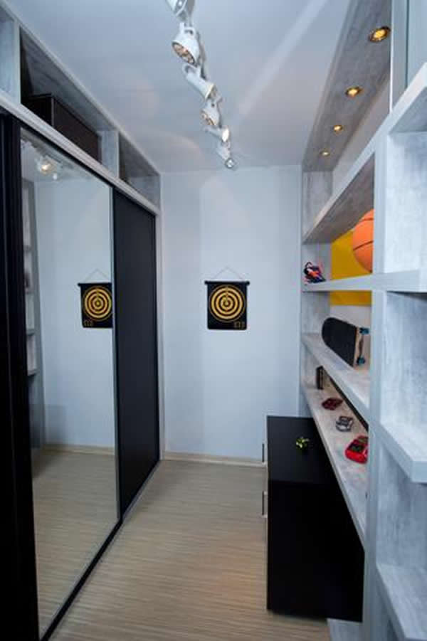 Um closet embutido na parede do quarto é uma ótima forma para economizar espaço.