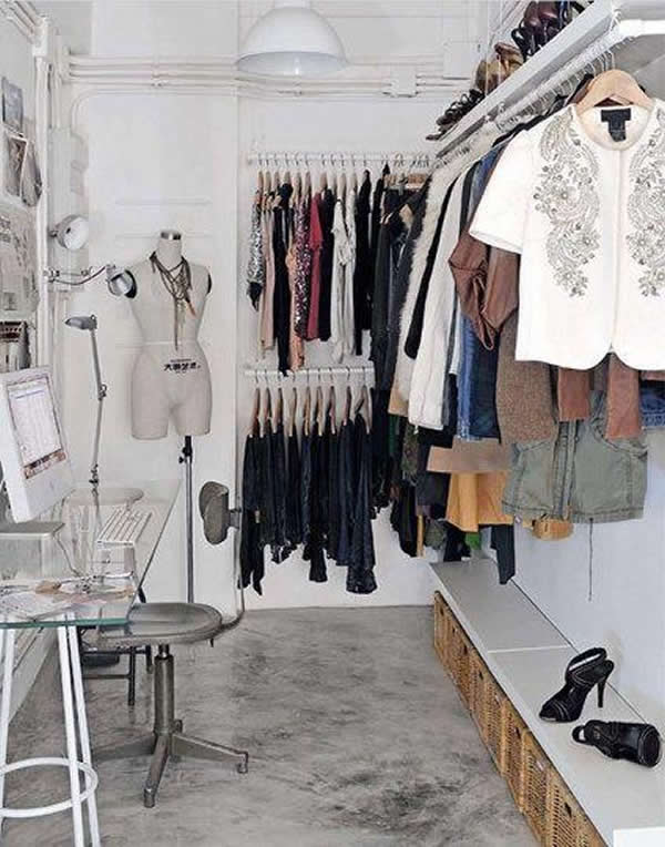 Para quem tem um espaço em casa que usa para trabalhar, mas deseja também ter um closet, saiba que dá para unir as duas coisas em apenas um ambiente. Você poderá montar o seu escritório junto com o seu closet, ou seja, colocar uma cadeira e uma mesa e claro um computador ou notebook e no mesmo espaço coloca-se os objetos para formar o closet.