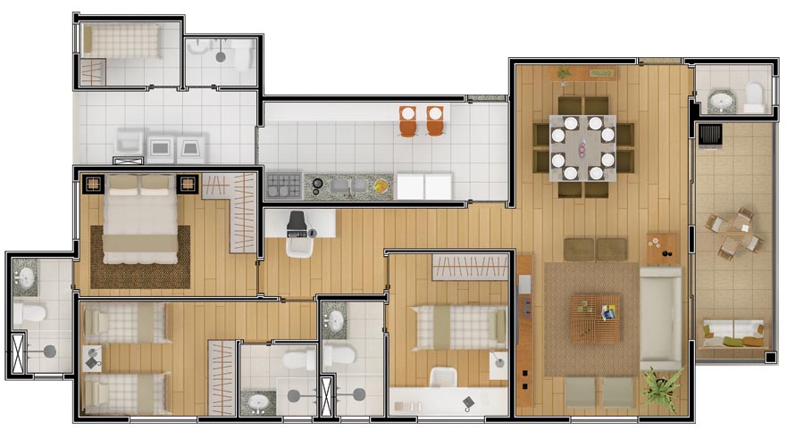 Para quem deseja uma casa maior, temos esse outro modelo de planta com três quartos e mais um outro quarto junto com a lavanderia, uma cozinha, todos os quartos são com banheiro.