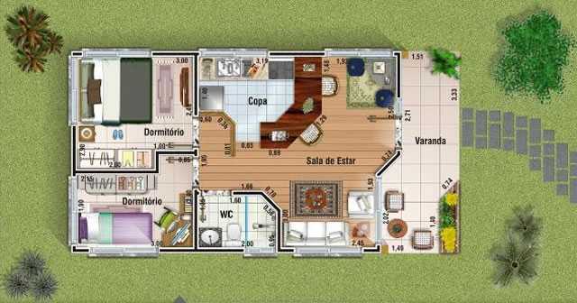 Começamos com essa primeira planta de casa que é uma casa própria para uma construção de casa de campo ou chácara. Nessa planta temos dois quartos, copa com sala de estar e um espaço para leitura.